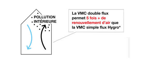 La VMC double flux garantit un renouvellement d’air très supérieur aux systèmes de ventilation traditionnels (un volume cinq fois supérieur à une VMC simple flux, notamment). Elle filtre jusqu’à 80% de ePM(2.5) et permet de diviser par quatre le taux de CO2 et de COV (composés Organiques Volatils) présents dans l’air des chambres à coucher (étude Octopus Lab, octobre 2018).