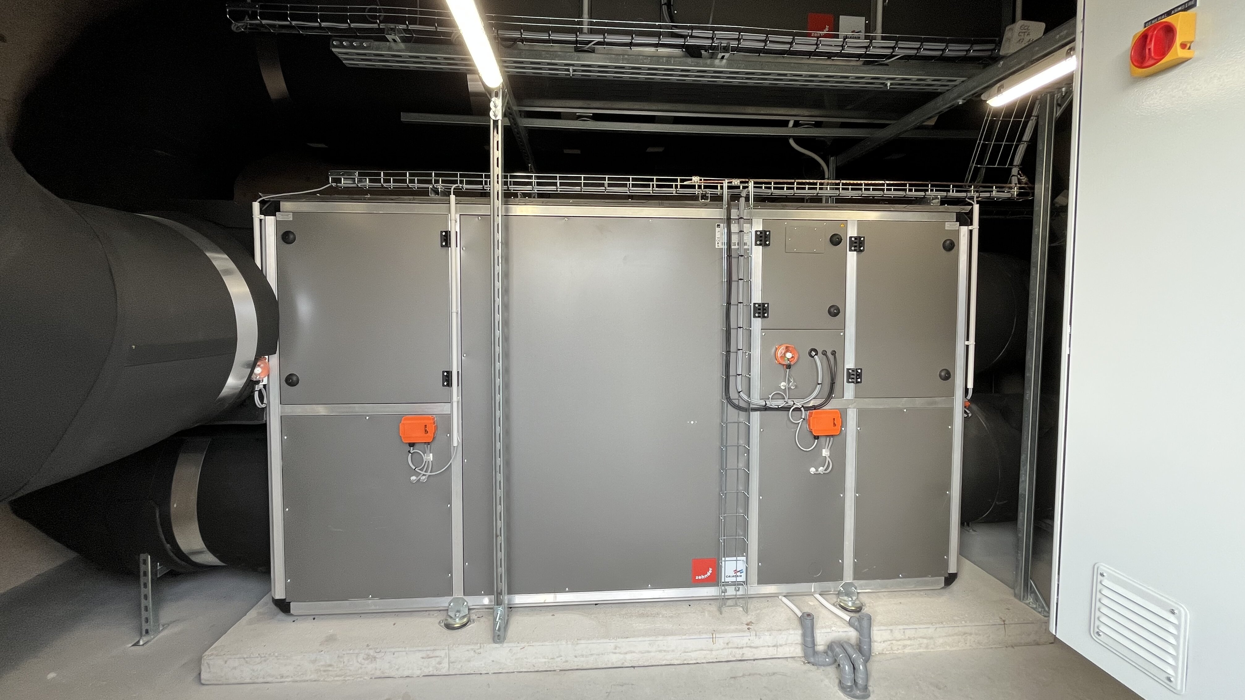 Pour garantir la performance énergétique du bâtiment passif, les bureaux d’études ont retenu trois centrales double‑flux Zehnder Carma, certifiées PHI (récupération de chaleur 86 %) et Eurovent.