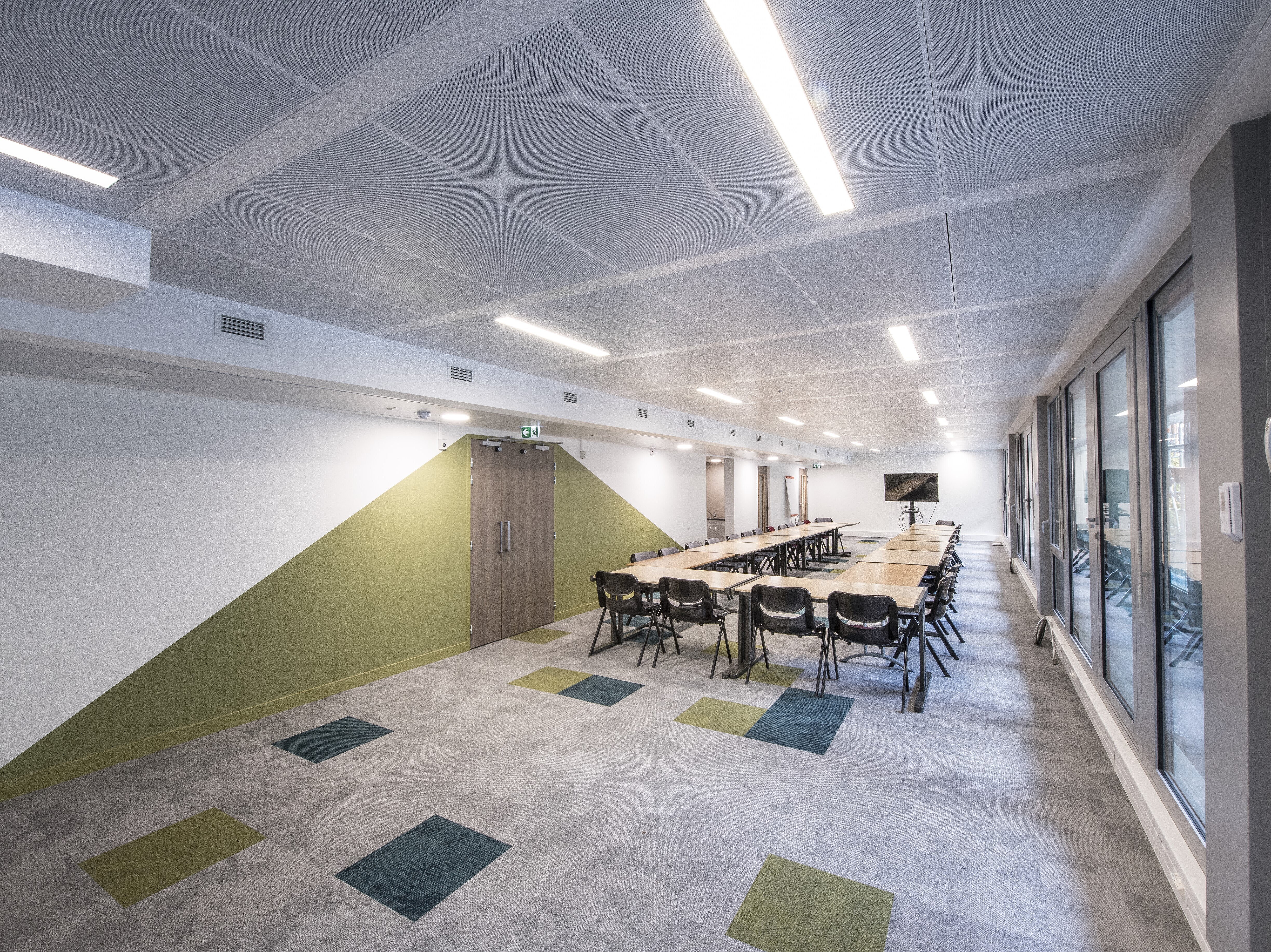 2360 m² de plafonds climatiques Zehnder équipent ce bâtiment. Cette solution technique choisie pour chauffer et rafraîchir les locaux a séduit par son intégration parfaite au bâti. L’espace au mur a été totalement libéré. La conception sur-mesure des bacs constituant le plafond a permis d’y insérer des luminaires ultraplats.