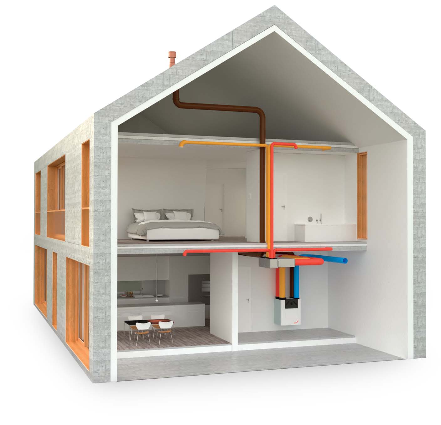 Le système de distribution d’air Zehnder véhicule l’air neuf tempéré de manière optimale vers les différentes pièces, en fonction des besoins, et l’air extrait est évacué à l’extérieur. Le débit d’air est ajusté aux besoins de chaque pièce.