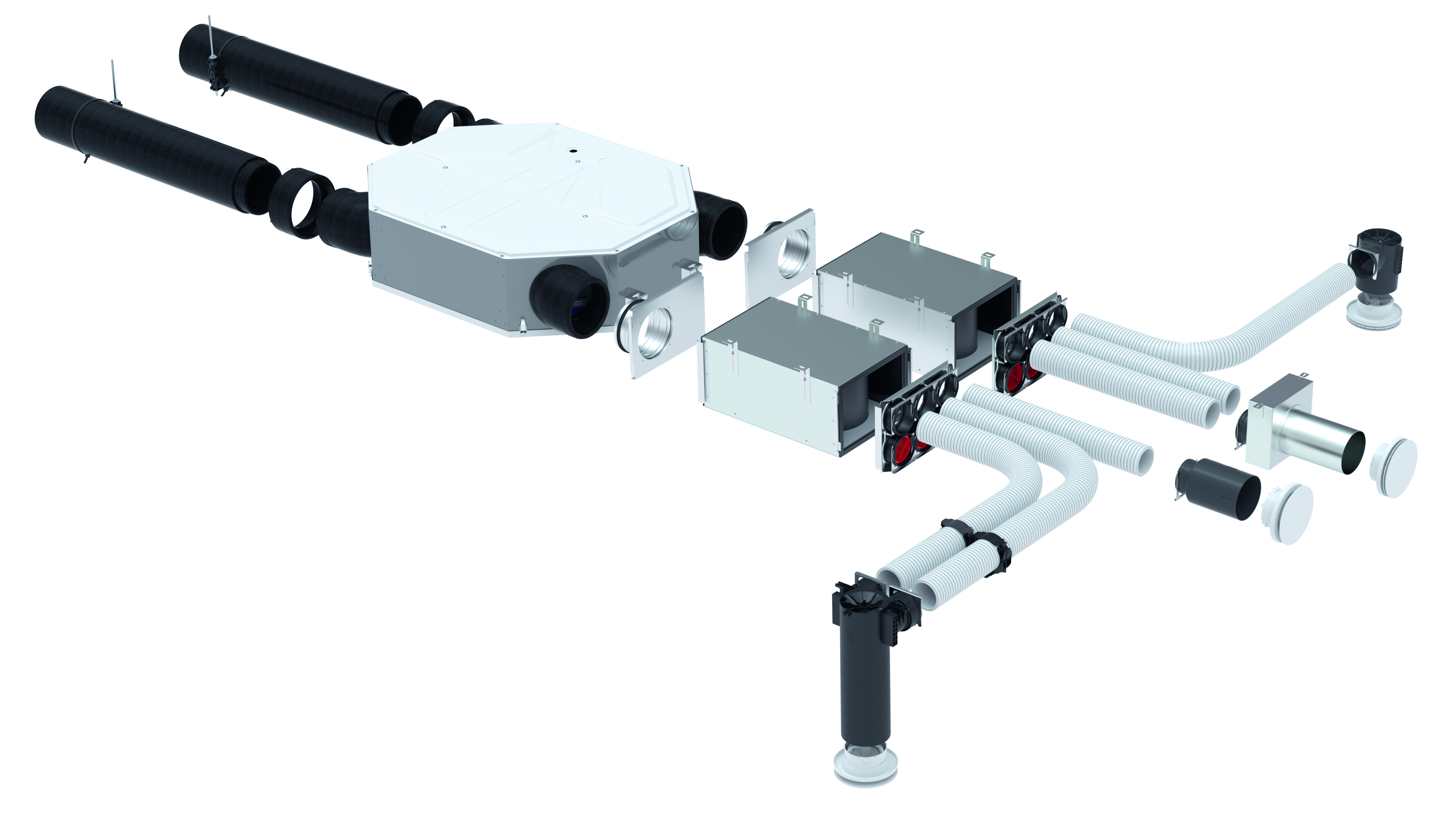 Cet ensemble regroupe les principaux éléments nécessaires à un système de ventilation préalablement dimensionné : l’unité de VMC double flux, le réseau primaire (réseaux isolés) et secondaire (conduits semi-rigides, silencieux, accessoires...)