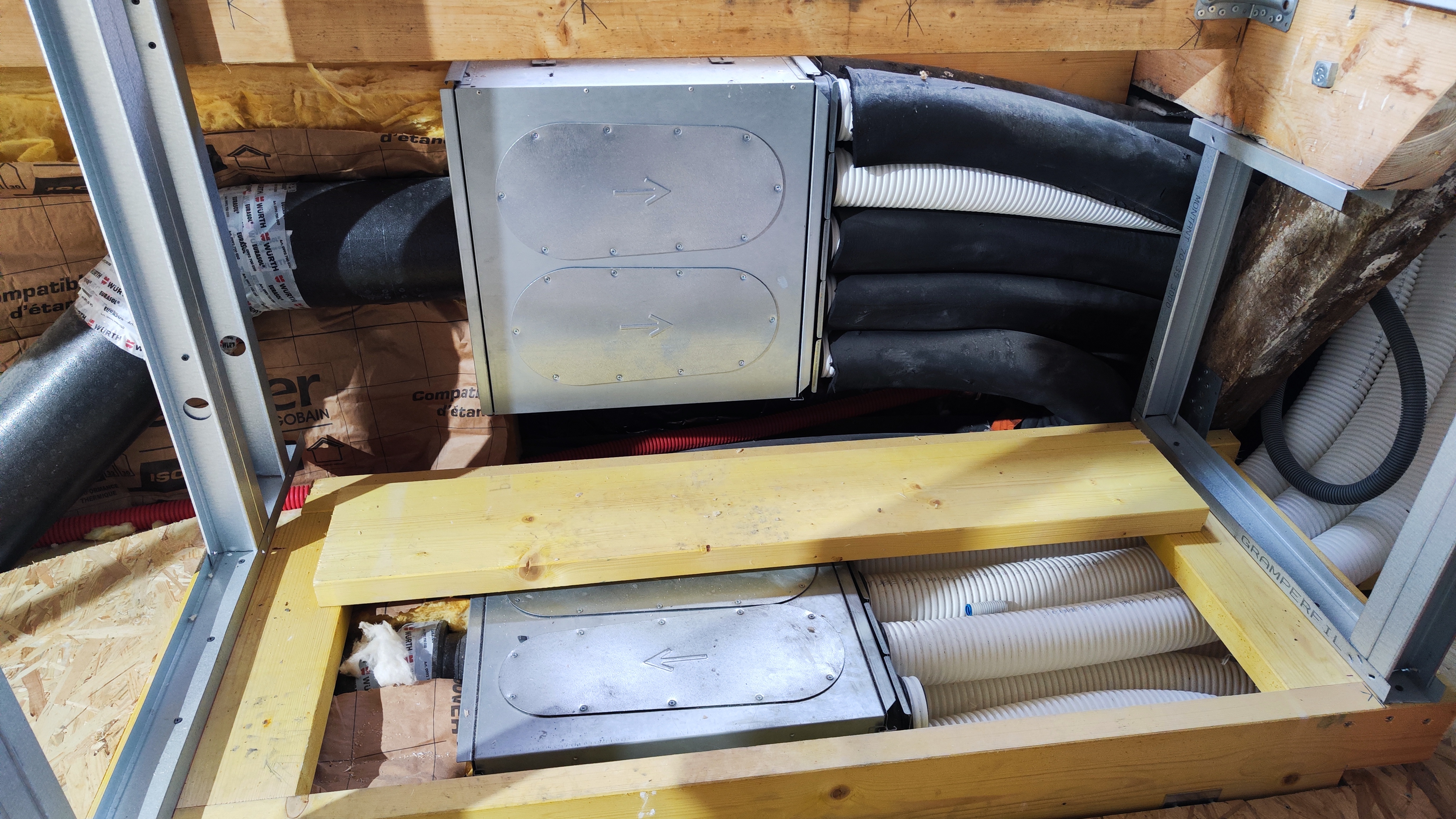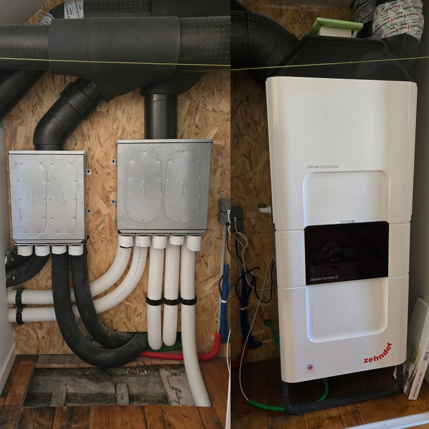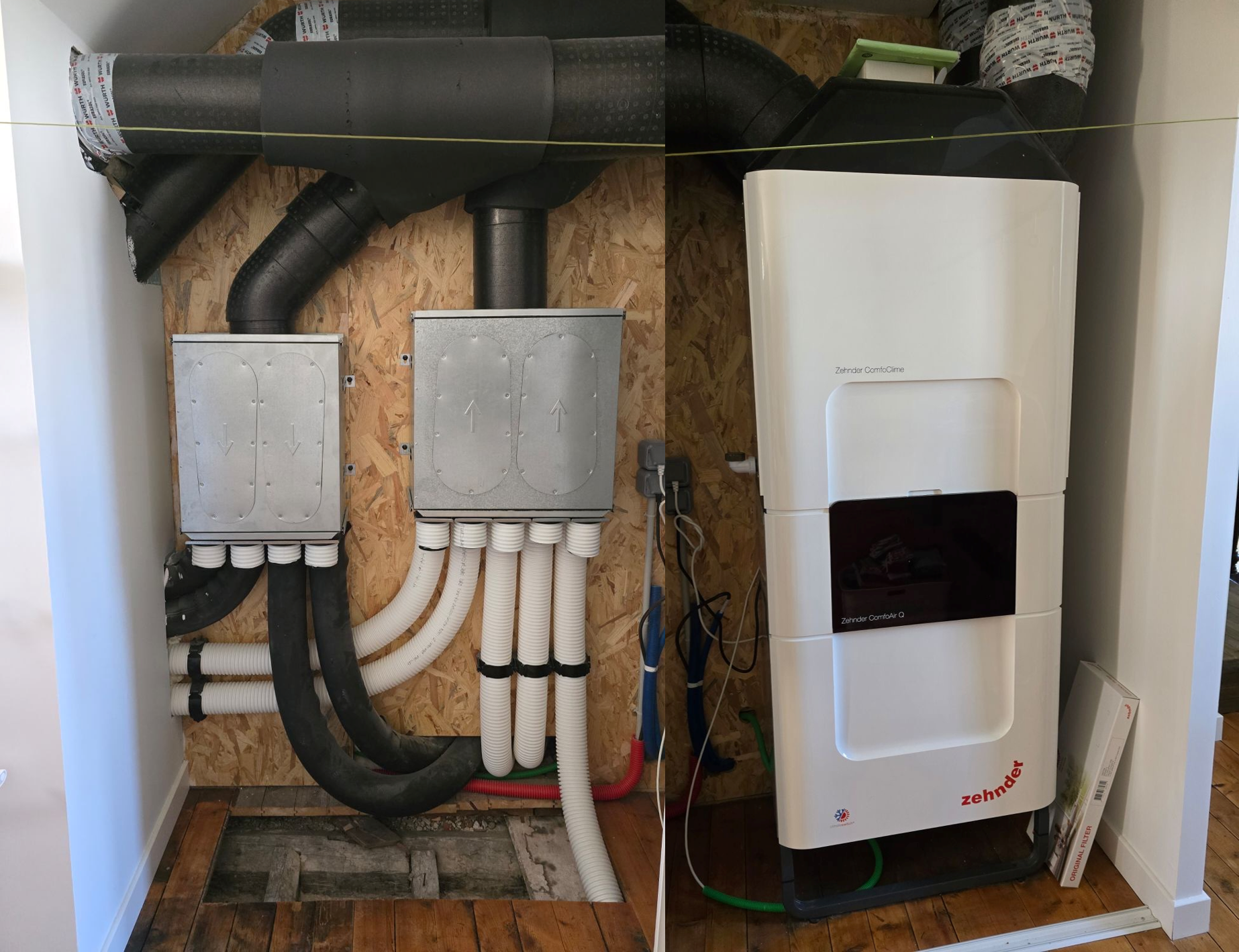 Pour répondre à ces exigences, une solution technique particulièrement bien adaptée a été mise en œuvre. Le système de ventilation double flux Zehnder ComfoAir Q 600 s’est imposé comme une évidence. Il assure un renouvellement continu de l’air tout en garantissant une excellente qualité de filtration. Ce dispositif a été couplé à une pompe à chaleur monobloc Zehnder ComfoClime 36, intégrée directement à la ventilation, permettant de rafraîchir les pièces de manière naturelle et efficace pendant l’été.